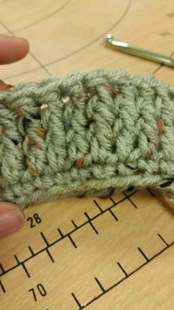 Fila: 13-17 poste frontal crochet doble en cada puntada, st sl, a color en tres (tan)