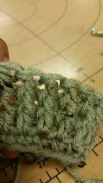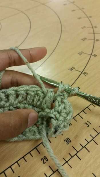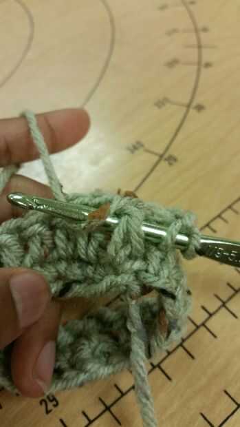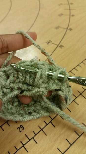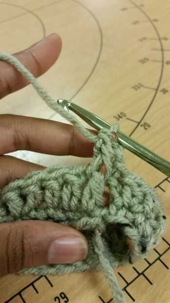 Fila 4: yo Inserte su gancho desde la parte delantera a la parte posterior de la primera ganchillo doble para que el stitch(post) está en el gancho. En este momento debe tener dos lazos y una puntada en su gancho. Hilo sobre y tire a través de modo que hay tres lazos en el gancho. Hilo sobre tire a través de dos lazos, hilado sobre otra vez y tire a través de los dos bucles hasta que haya un bucle en el gancho. Es su primera puntada de crochet doble poste frontal.