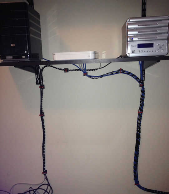 Terminado!  Esta fotografía muestra la versión de "después" de la gerencia del cable.  Los cables de alimentación son envueltos y cayó verticalmente en el lado izquierdo.  Los cables Ethernet son envueltos y cayó por el lado derecho.