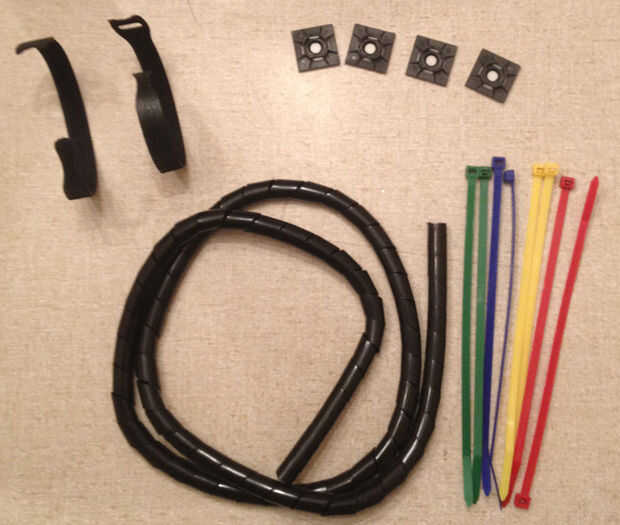 decidí usar las almohadillas de montaje negro, la envoltura de la espiral negra y los lazos de alambre multicolor (zip strips).  Si usted puede encontrar todos estos en una tienda, más poder para usted.  También se incluyen en este cuadro son lazos de alambre reutilizable de velcro 2.  Mi corre cable no era que durante mucho tiempo así que no uso.  Incluido en esta foto por si acaso usted podría encontrarlos y quería utilizarlos.  Encontré estos en línea.  Creo que fue de $6 por 100 de ellos.  Si lo prefiere utilizarlas en lugar de los lazos de alambre plástico (zip strips) por favor no dude en hacerlo.