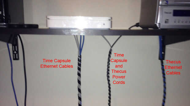 apliqué el abrigo espiral a los cables de alimentación de la cápsula del tiempo y el servidor de medios de Thecus.