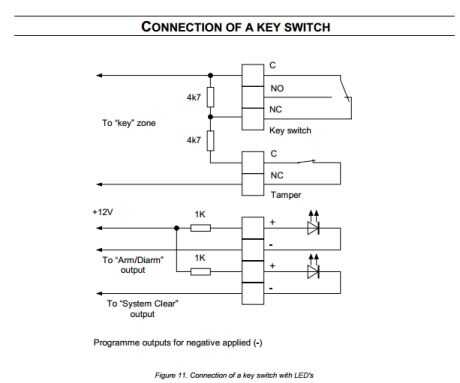 Esto normalmente es algo que usted puede atar con alambre a un dispositivo - como una llave física necesita Introduzca y gire a armar y desarmar la alarma - podemos utilizar esta entrada para control de armado y desarmado de la Aruino. He incluido el circuito para esto en las fotos anteriores.