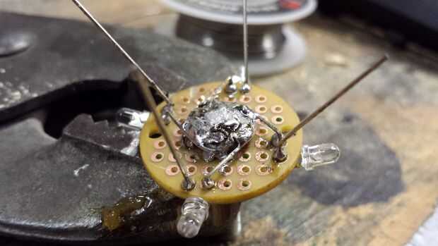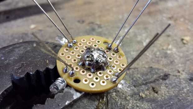 ahora que el perno está recubierto de estaño, podemos utilizar el cautín para conectarlo a la placa. en primer lugar, la soldadura tanto del perno como puedas a los contactos de la Junta para que encaje en su lugar. después de eso, soldar todos los cables positivos de los LEDs a la cabeza del perno.