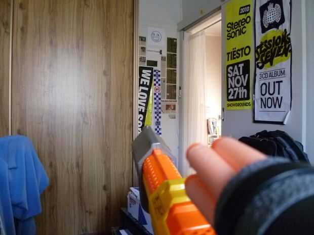 El lanzador del fuego, sostenga el mango con la mano izquierda y gire en sentido antihorario. Debe girar la llave del agujero rectangular en la pieza cilíndrica y un sonido de estallido ruidoso como los dardos se disparan (algo violentamente) del tubo de lanzamiento en un aerosol.