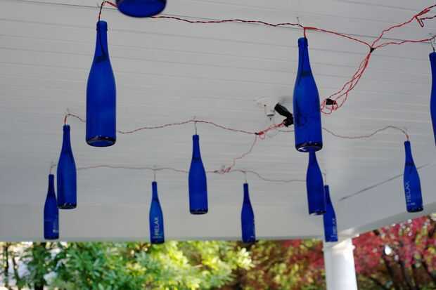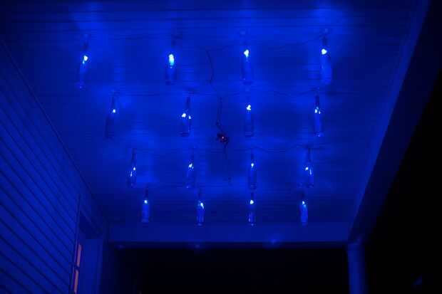 Reciclar algunas botellas de vino y establecer un estado de ánimo con este simple artefacto de iluminación LED. Improvisé un botellero de madera contrachapada fina porque la mitad de las botellas se tapan con corcho y la otra mitad eran tipo tornillo. Corté los titulares en una sierra de cinta siguiendo el patrón siguiente.