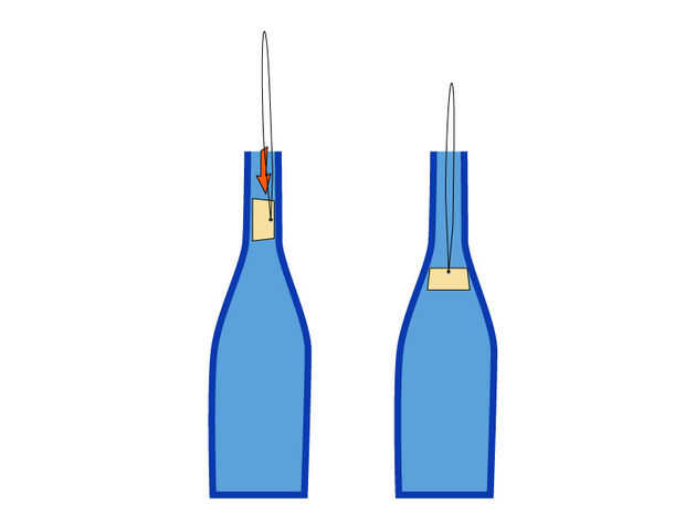 Hacer aproximadamente 8" largos bucles de cuerda y sujete a los sostenedores de botella a través de los agujeros. Inserte el LED abajo en el cuello de la botella, seguido por un sostenedor de botella (no olvide mantener pulsado de la cuerda). Dar a la cadena un poco de un remolcador que hacerlo firmemente alojada allí.