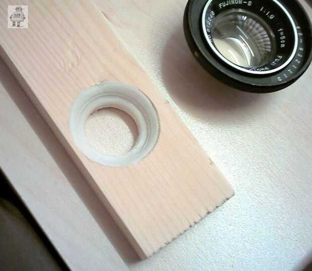 Para obtener una superficie más suave que se adapta correctamente a la lente, usé algunos plástico polimorfo. Calentado en agua caliente y enrollado en forma de salchicha delgada, puede ser rizado redondo el agujero y luego alisa rápidamente en su lugar con un dedo. Prensa bien en la madera, atornille la lente lo más lejos posible. Que cool y conjunto.