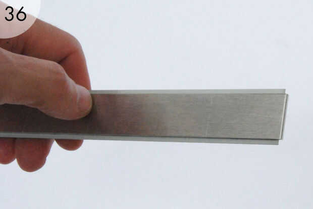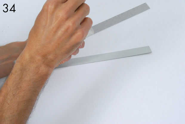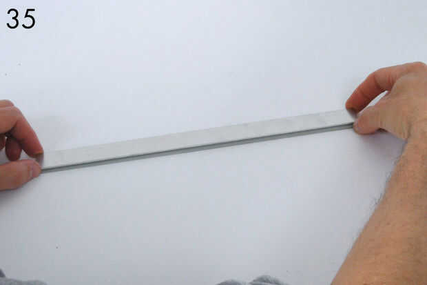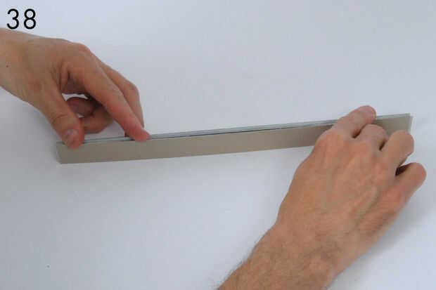 Los carriles del medio sólo tiene tapas, porque ambos lados son idénticos. Aplique la cinta a un lado del carril medio relleno de sándwich al igual que en el paso 7. Seco montar las partes al centro de una tapa de extremo a extremo y de lado a lado sobre el sándwich relleno (32-33). Este es el paso más en el proyecto, porque tienes la tapa de carril medio en todas las direcciones a lo largo del relleno sin la ayuda de una mesa de centro. Puede resultarle más fácil hacer la media tapa carril sobre el relleno, o viceversa. Cuando confiado, retire el papel protector y pegan cuidadosamente las piezas entre sí (34-37).