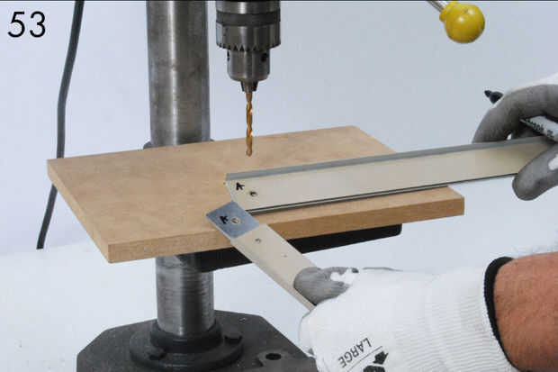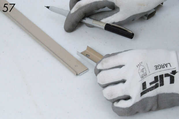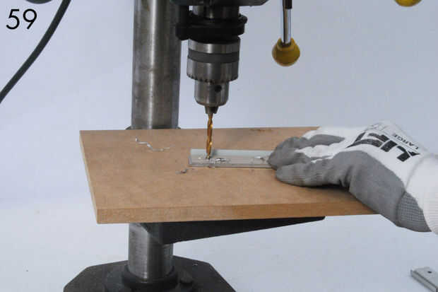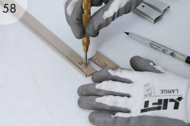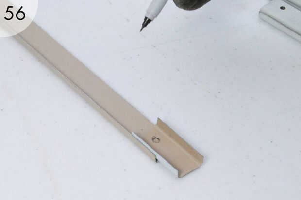 - Ahora coloque una abrazadera en cada extremo del riel superior como se muestra y marque el carril (56-58). Etiqueta las abrazaderas y el carril superior así que usted puede encajen más tarde. Estas dos últimas perforaciones a través del riel superior (59).