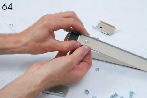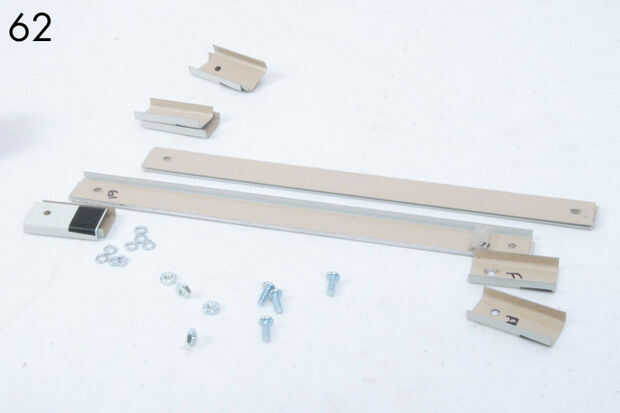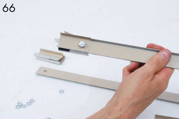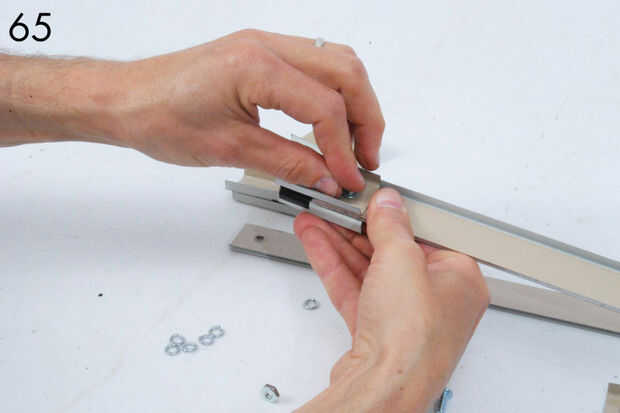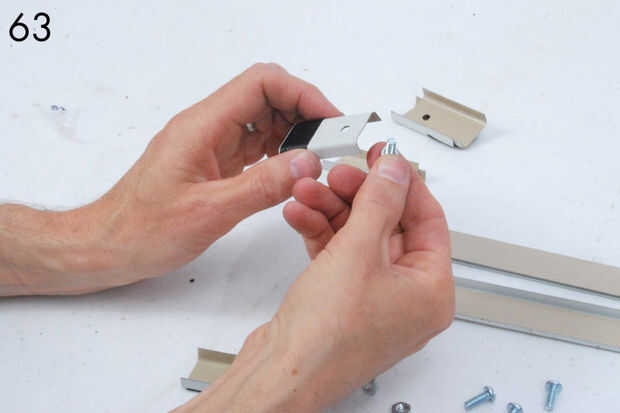 Se reúnen el carril superior, el carril central con agujeros, las ocho abrazaderas y los herrajes que se muestran en (62). Si su material tiene película de plástico, quitar marcha a lo largo. Utilice #10 x 1/2 "tornillos para montar las abrazaderas a los rieles. Va como esto: tornillo, arandela, abrazadera (63), ferrocarril (64), abrazadera, arandela (65), tuerca (66). No apriete en este momento; Deje las pinzas suelto y libre de oscilación.