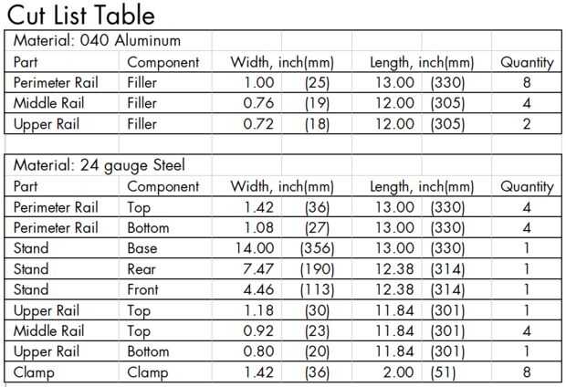 Cortar la chapa metálica y piezas de relleno según la tabla de lista de corte. Utilice un recorte grande, corte recto, o mucho mejor, una "guillotina" esquileo. Se utilizó un corte de alimentación de lujo (05-07).