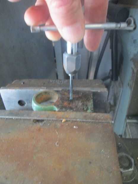 Perfore un par de los agujeros preperforados en la mandíbula corrediza. Sólo podía perforar en profundidades de aproximadamente 1/4 de mi mordaza. I fondo aprovechado estos agujeros para una rosca 6-32. Se enrosque la arandela de sujeción acentuado en estos orificios. Pongo los agujeros en un par de lugares para mover el perno para mejor acomodar la pieza de trabajo.