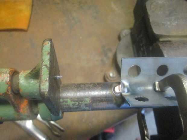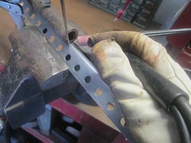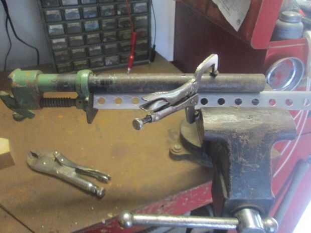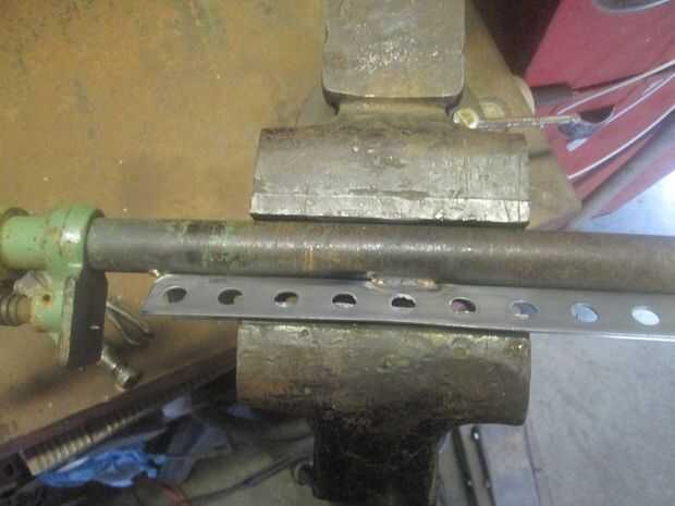 Monte el extremo de la abrazadera movibles de la mordaza de tubo de 12" pedazo de tubo. Cerrar el vicio como tope y fijarlo con la abrazadera a la parte posterior del ángulo de hierro. Utilice abrazaderas para sujetar en su lugar. I TIG había soldado en varios lugares usando varilla de latón. Probablemente podría perforar y perno si no tienes un soldador.