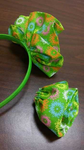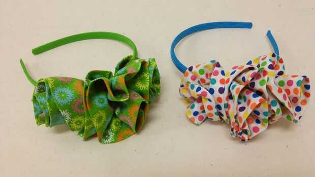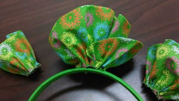 Coloque a una tela grande rosa del centro de la diadema y seguro con hilo y aguja. Lugar una pequeña tela rosa a cada lado de la grande y mano coser a la diadema también.