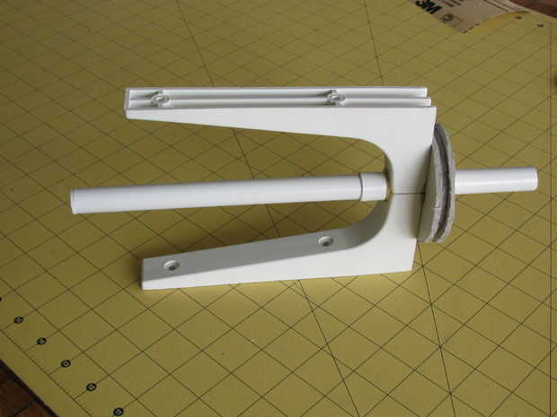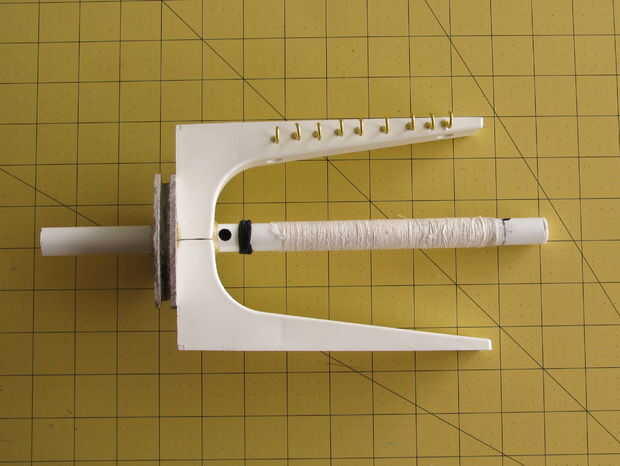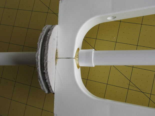 Cuando los soportes se fijan, inserte el eje de volante a través del agujero de los soportes, luego a través del agujero en el volante. Pegar todo junto. Deje aproximadamente 1" del huso que se pega hacia fuera más allá de la rueda motriz. Este final es el final del orificio.