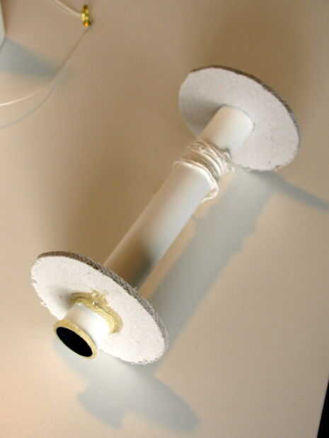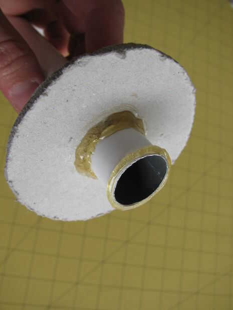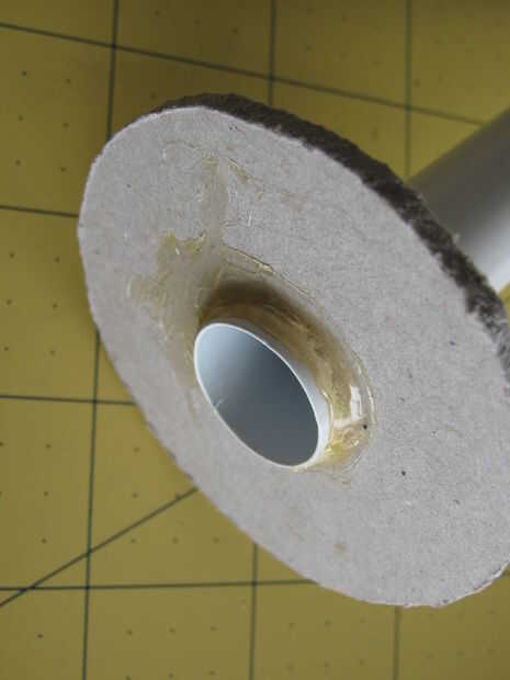 Corte los orificios de la base en los centros de los restantes dos 3" círculos de conglomerado. Pegue los círculos para cualquiera de los extremos de la base. Un círculo se debe pegar como cerca del extremo como sea posible, debe ser el otro círculo de 3/4" del extremo de la base.