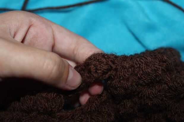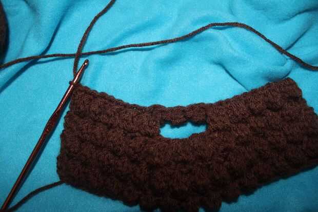 Fila 9: ch1, a su vez, sc 10 veces, trabajando en el espacio de ch - * bobble, sc * 3 veces, bobble, sc (ahora trabajo en los puntos de sutura) 10 veces