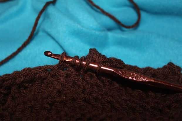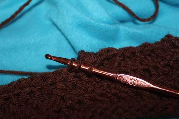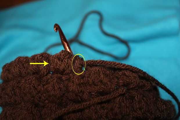 Fila 6: ch2, a su vez, hdc, * hdc, bobble stitch * 4 veces, * hdc2tog, bobble * 2 veces, hdc, * bobble, hdc2tog * 2 veces, * bobble, hdc * 4 veces, hdc (27 puntos)