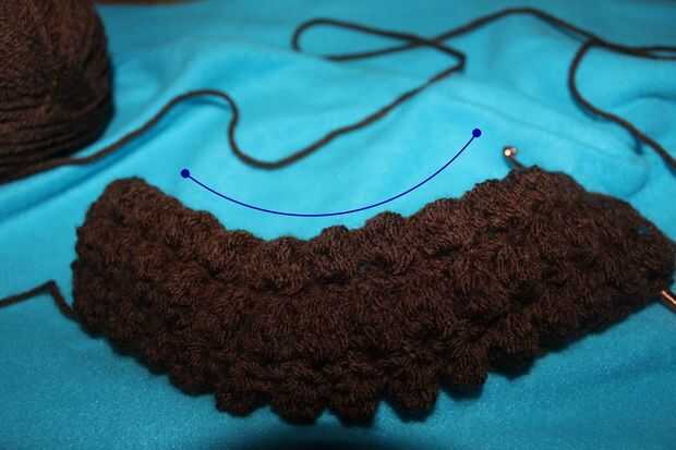 Foto C muestra la comparación de una hdc normal y un hdc2tog. La fl echa señala el hdc y el círculo muestra la hdc2tog. Notará la diferencia. Foto D muestra la fila completa, tenga en cuenta que las puntadas de hdc2tog crean una curva leve en la barba, que le ayuda a encajar tu rostro.