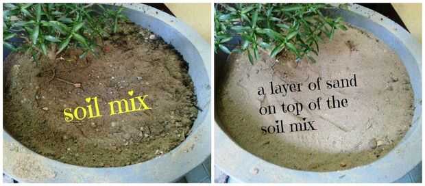 La mezcla de suelo estaba oscura, así que llené la parte superior de la mezcla de suelo con una capa de arena (la capa de arena es menos de una pulgada).