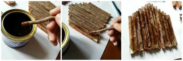 He aplicado el pegamento de madera encima de los palos dispuestos, sobre todo entre cada 2 palos,