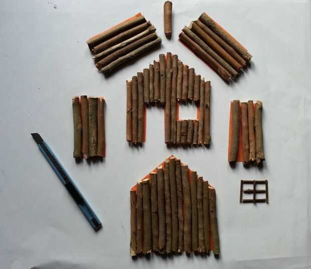 Coloque los troncos de árbol (uno por uno) en la plantilla, marca la zona que los partidos con el tamaño de la plantilla y usar el cuchillo para cortar la rama pega en esa zona, empezar a medir y la rama de la corte se pega de un lado para cada parte de la plantilla,