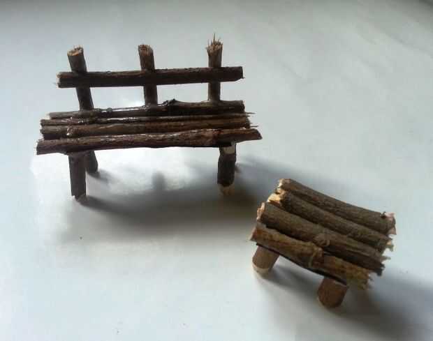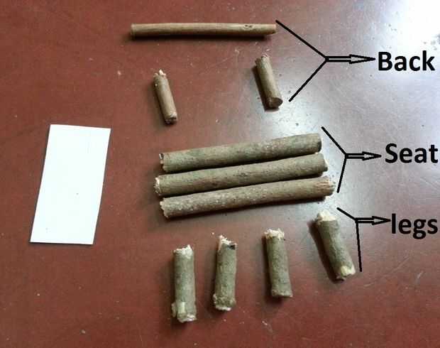 Cortar un pequeño trozo de papel, pegamento 3 palos en él (para hacer el asiento). Ahora dan la vuelta y pegar 4 palos en 4 esquinas para las piernas. Finalmente hacer la parte posterior y pegar para completar el Banco.