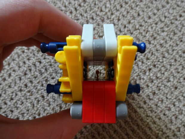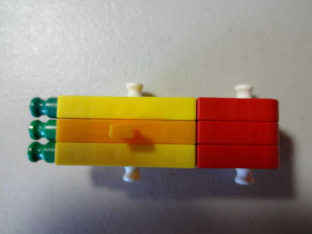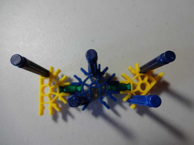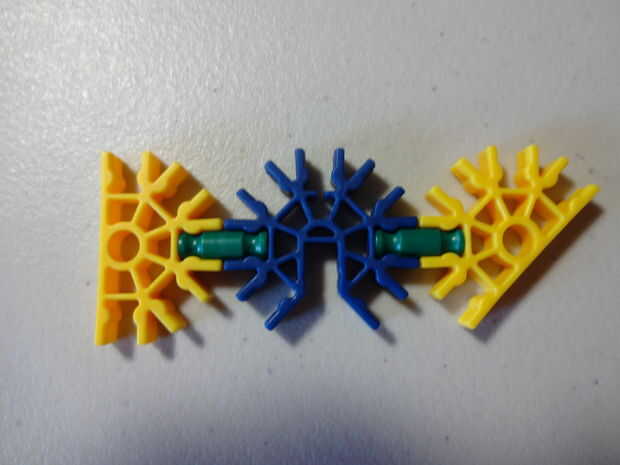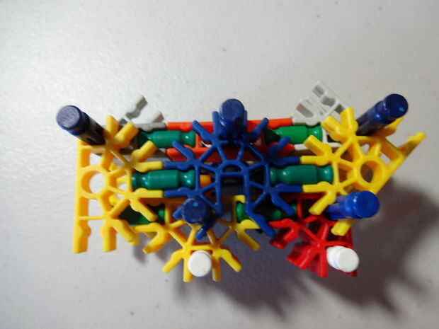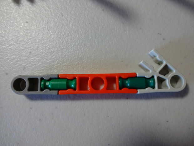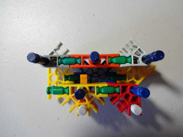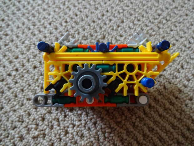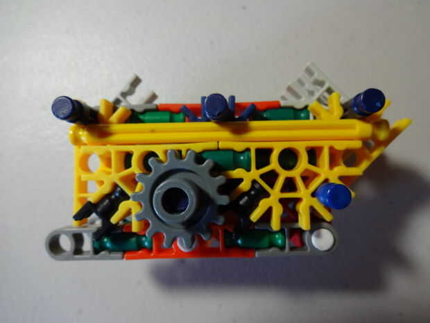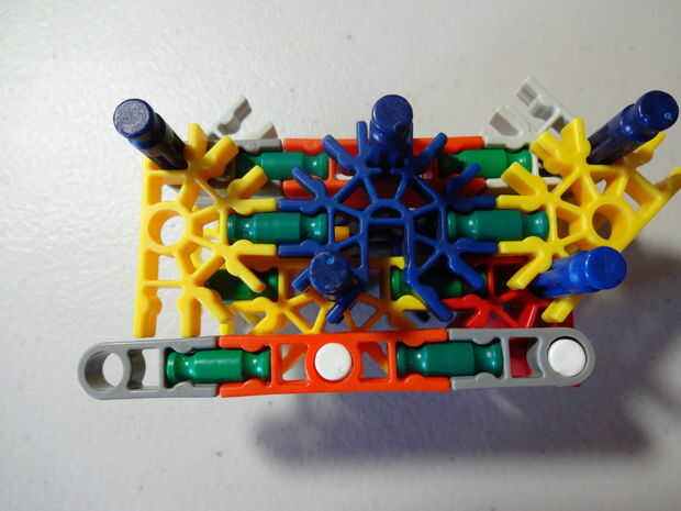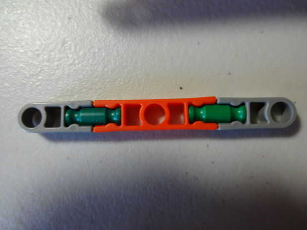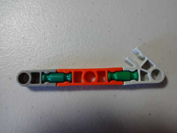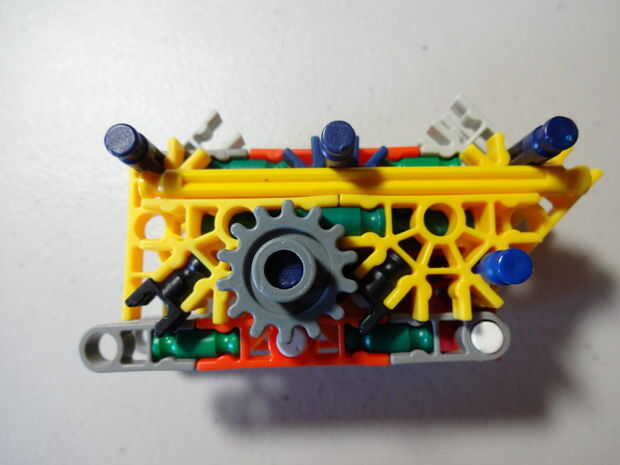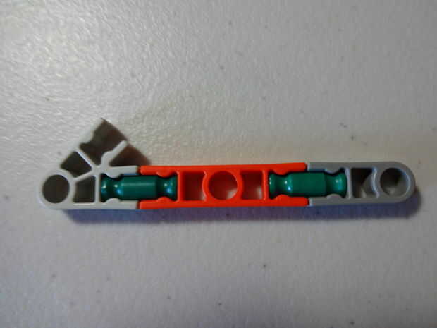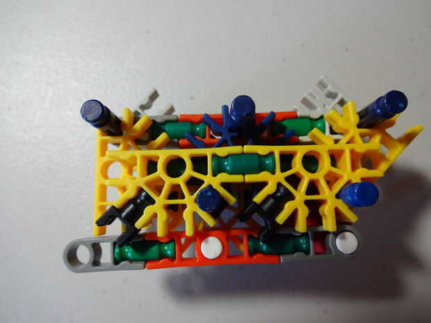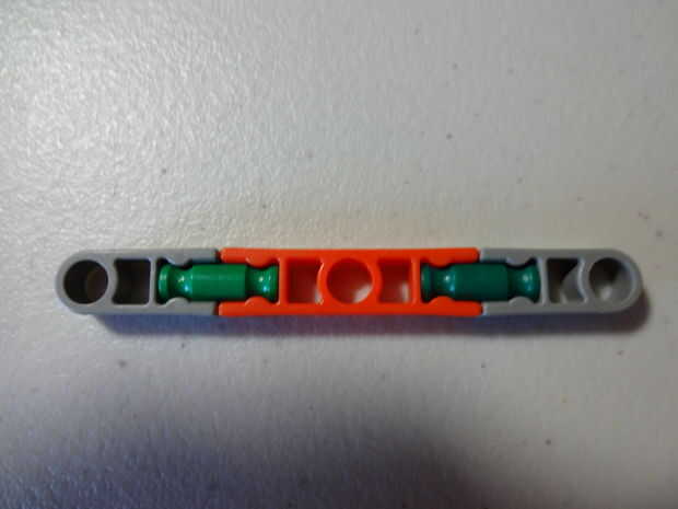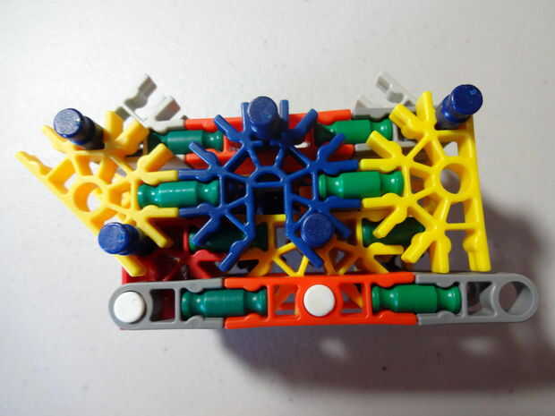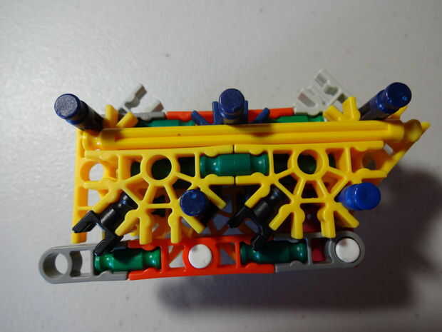 muy sencillo y original diseño. No use demasiadas piezas.Barras:Verde 395 gris2 azulConectores:2 amarillo23 naranjaVerde 154 rojoGris oscuro 15Otros:4 separadores azul6 espaciadores gris2 conectores 'Y'Paso 1: piernas Conectores naranja 64 conectores