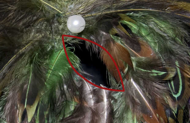 7. Si te estás preguntando sobre cómo formar las plumas alrededor del ojo, ver la tercera imagen. Después de pegar las plumas, solía tijeras eliminar extremos afilados y crear más espacio. No recomiendo cortar el ojo completamente, esto a menudo crea un borde afilado que se ve mal en las fotografías.