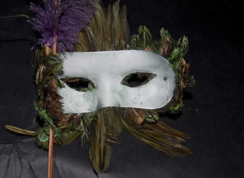 3. una vez seca la pintura, empecé a pegar las plumas. (Véase la segunda imagen para la dirección de la pluma en mi máscara). Como he mencionado anteriormente, las grandes plumas verdes eran muy difusas en las bases, que cubriendo la máscara mucho más fácil.