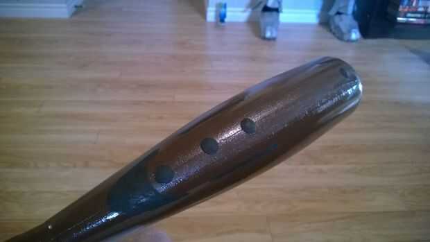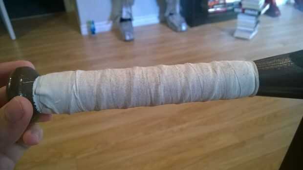 Finalmente, para el agarre, utiliza cinta de hockey blanca que envuelve alrededor de la manija y aplicar alguna suciedad para lo del tiempo.