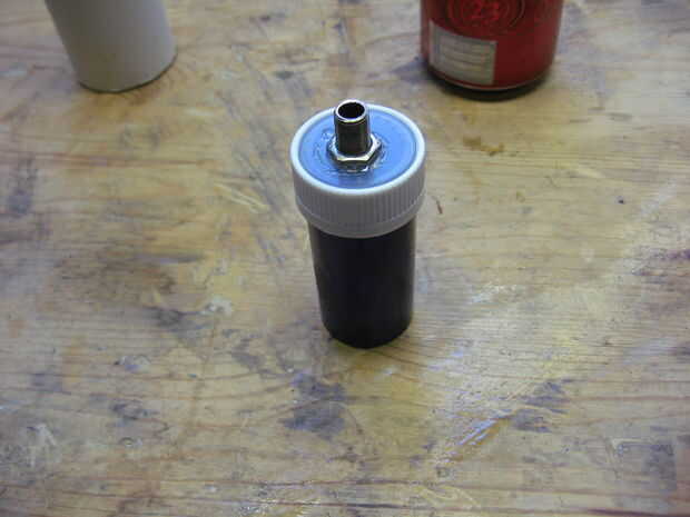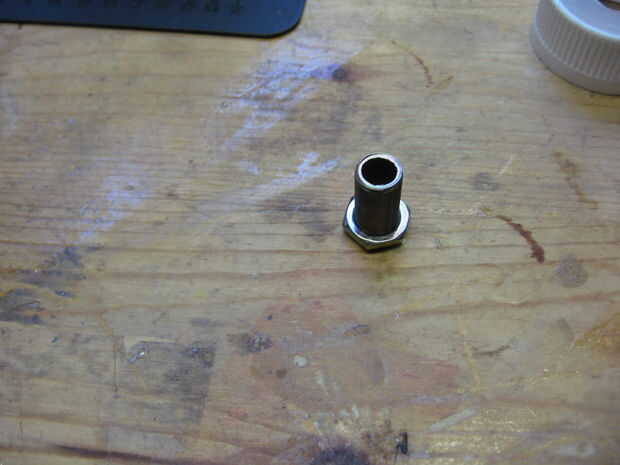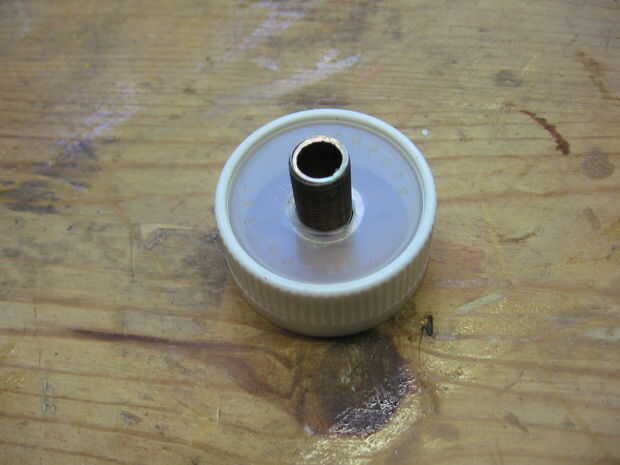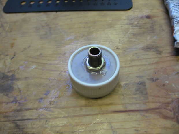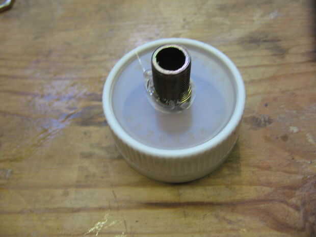 Una vez que se perfora el agujero del hilo de rosca de las tuercas de la lámpara en el pezón. Presione el pezón hacia arriba a través del agujero en la tapa. Manchar algunos E-6000 alrededor de la entrerrosca donde sobresale a través de la tapa. Luego enrosque la tuerca segundo sobre de la entrerrosca y apretar en el pegamento.