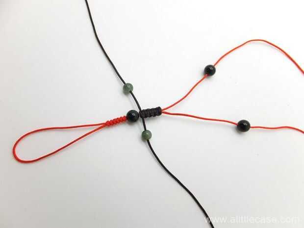 Del hilo de rosca 4 granos terminado el trenzado. Los granos negros en el cable negro como pies del hilo de rosca y las perlas de jadeíta verde se roscan en el cable rojo como manos.