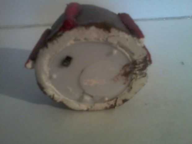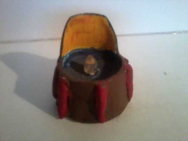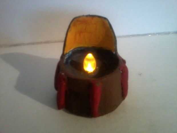 Este es el altar. Se hace de una vela electrónica. Envuelto de arcilla alrededor de él, deje que se seque y agrega más capas de arcilla, permitiendo que cada nueva capa se seque antes de que trabajé en él otra vez. La parte trasera se añadió, como fueron las costillas a los lados, luego pintó con pinturas acrílicas. La vista de la parte inferior muestra la puerta encendido y apagado del interruptor y la batería de la vela.