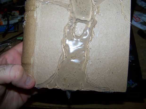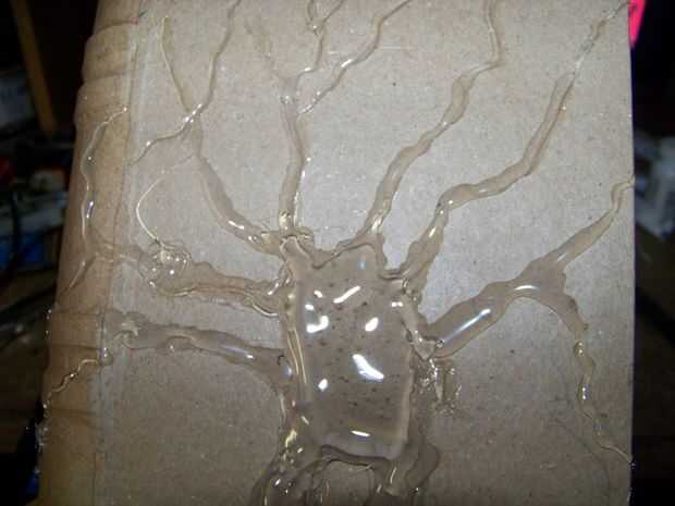 Padre y yo utiliza la pistola de pegamento caliente en baja para seguir mi diseño. Y trazó el contorno con el pegamento. Le llevará tiempo y deje que el pegamento se enfríe antes de añadir más. Tuvimos que detener el tiempo unos para dejarla enfriar para que podríamos construir el tronco del árbol para arriba. Me alegro realmente que dejé el agujero de nudo en el tronco.
