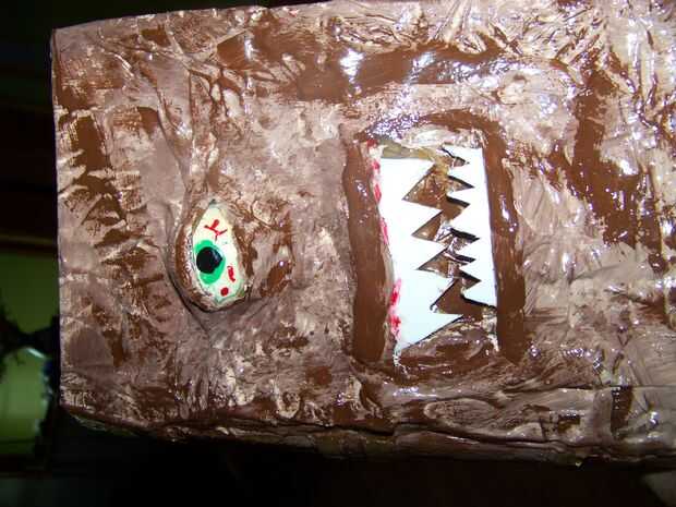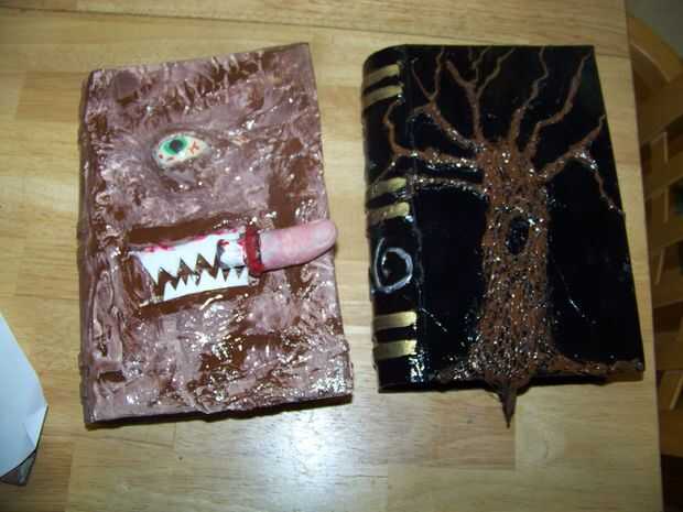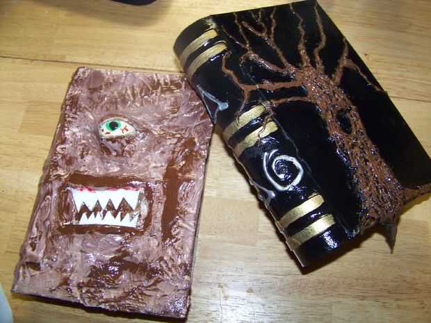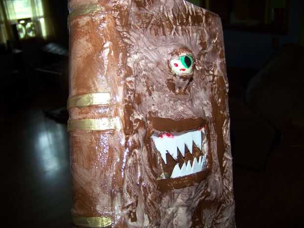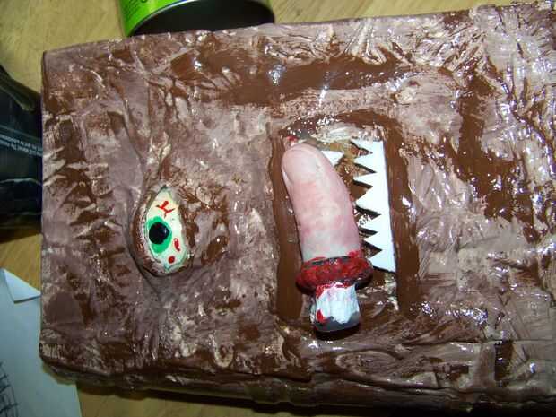 Aquí es algunas fotos del mi papá hizo su versión de un Necronomicón. Utiliza el mismo proceso pero añade media pelotita de ping pong para un ojo y los dientes de lo envase de cool whip.