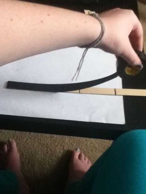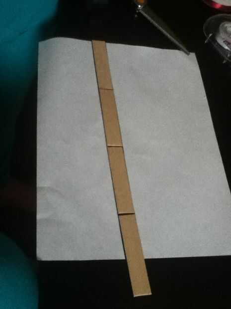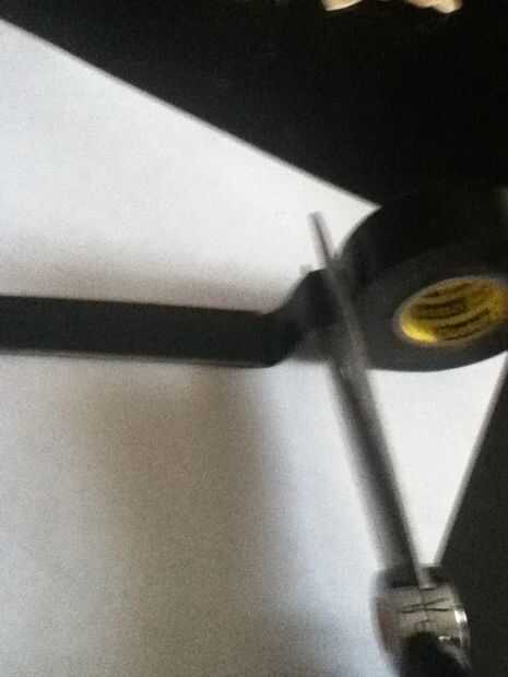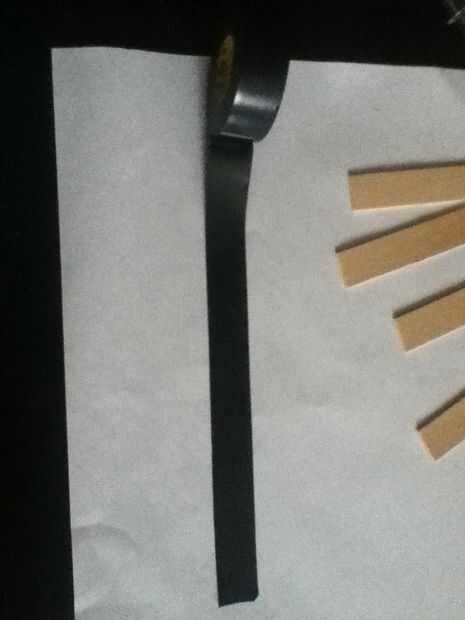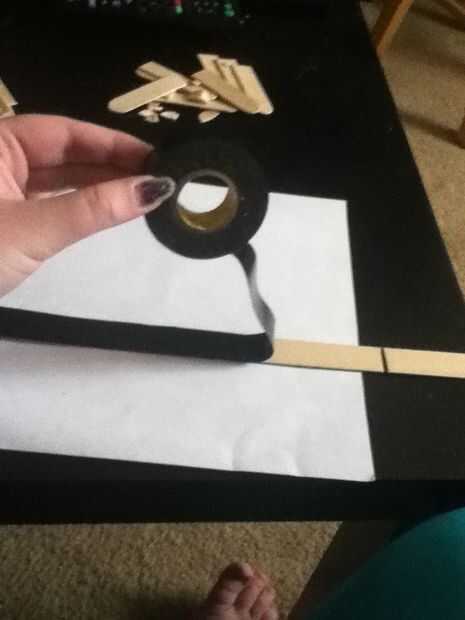 Colocar la cinta aislante con el lado adhesivo hacia arriba. Colocar 4 palillos en la cinta. No quiero ponerlas demasiado cerca o demasiado lejos aparte. A continuación, llevar la cinta sobre los otros lados de los palos. Deja un poco extra para conectarlos.