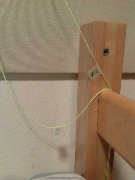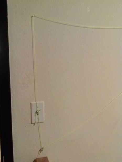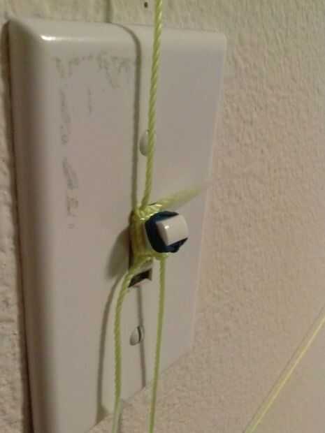 Empezar por atar un extremo de la cuerda en el interruptor de la luz, como se muestra. No te preocupes la goma todavía; vendrá más adelante. Después de atar un extremo del switch, empezar a enhebrar la cuerda a través de la vía superior, siguiendo el rastro de tachuelas hasta una longitud de cadena colgando hacia abajo por la cabecera de su cama. Cortar la cadena en este punto y empezar de nuevo del interruptor. Ate la cuerda en el interruptor, pero ir de la ruta de fondo esta vez. Consulte las fotos para ver ejemplos. Una vez has roscado ambos cadenas, poner gomas en las chinchetas. Esto mantiene las tachuelas juntos y también garantiza que las cuerdas estancia contra la pared.