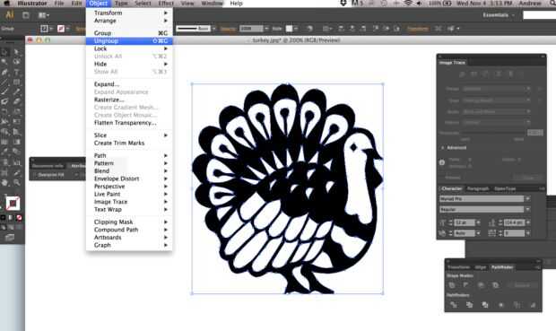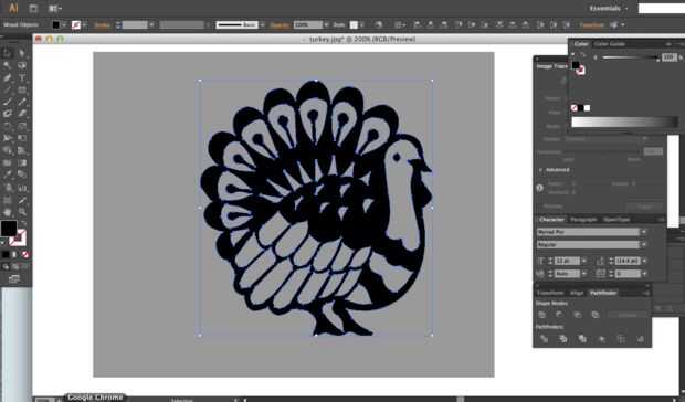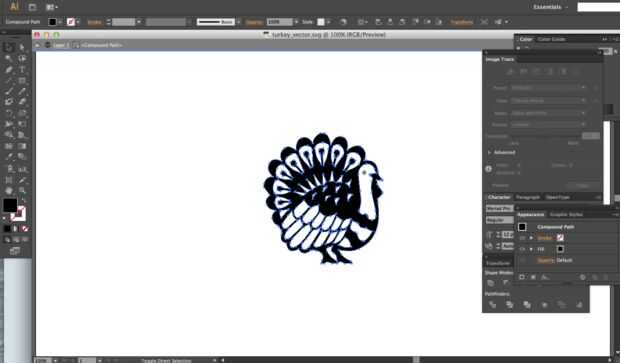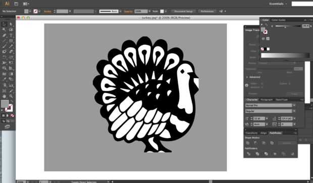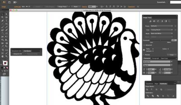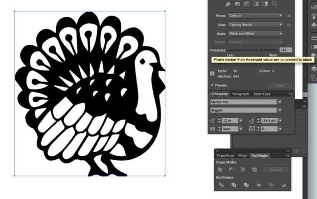 -La función de seguimiento de la imagen (se puede ver el botón directamente sobre la parte de trasera de Turquía) se aproximan los límites y nos dan duros formas basadas en las áreas de color. Haga clic en él y se puede ver la configuración por defecto ya está bastante cerca de lo que queremos - un contorno limpio sin conexiones reales delgada entre las masas. Jugar con los ajustes un poco para ver cómo cambia la imagen de previsualización. Asegúrese de que está marcada la casilla de cambiar de "Vista previa". Haga clic en expandir para finalizar - en el menú superior o en objeto > Expandir. Ahora han oficialmente vectorizadas.