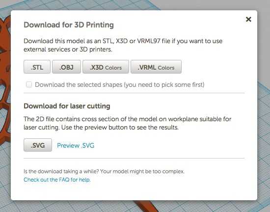 Utilizo un Dremel Idea constructor, por lo que es tan fácil como hacer clic en diseño > descargar para impresión 3D. Luego se te presentará con algunas opciones de archivo diferente. STL es el formato de archivo ubicuo que trabajo más controladores de impresora 3D, tan sólo, haga clic en el botón para iniciar la descarga.