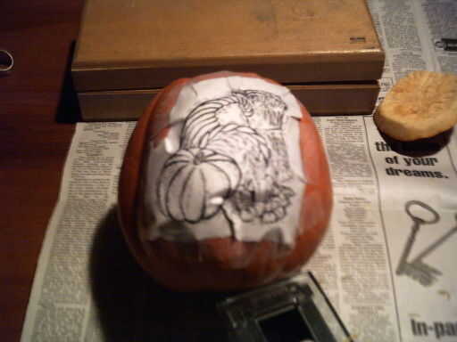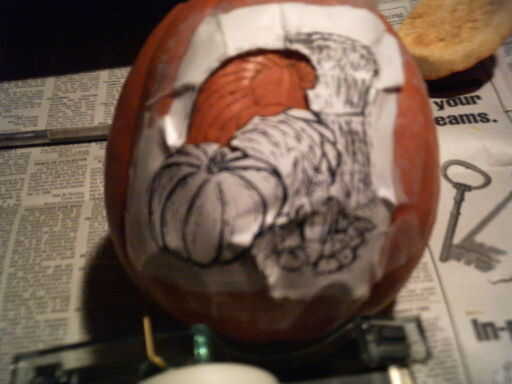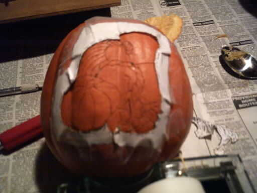 Ahora que has limpiado la calabaza hacia fuera, usted puede averiguar dónde desea colocar sus diseños que has elegido o hecho. Una vez que encuentre ese lugar especial, con cinta adhesiva el diseño a la calabaza. Usando los cuchillos de talla, delinear el diseño en la calabaza. Desde el centro y su forma de trabajo hacia fuera (mi contorno se ve mejor luego el producto terminado: P).
