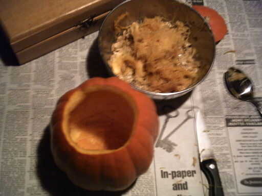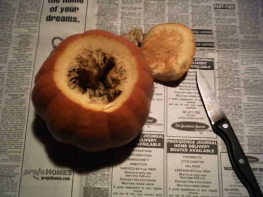Primer objetivo es "destripar" la calabaza. Para ello, primero debemos cortar la cubierta. Ángulo de la cuchilla grande en aprox. 45 grados hacia el interior, cortar un círculo que será suficientemente grande para que su contenedor de alimentos caber a través. Saque la tapa y retire la pulpa de la parte inferior utilizando el cuchillo. A continuación utilizando una combinación del gran cuchillo, una cuchara y las manos, limpian el interior del calabaza fuera. Tratar de conseguir el tanto de la pulpa y las semillas hacia fuera como sea posible.