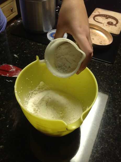 Después de la mezcla, vierta 2,5 tazas de harina a la mezcla.
