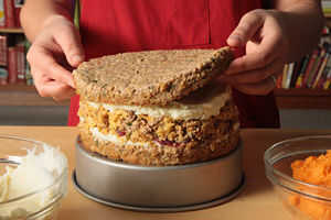Transferir el molde para pasteles o plato de servir con el pastel parcialmente ensamblado a una bandeja de horno y cocer al horno hasta que caliente, unos 30 a 40 minutos (un termómetro de lectura instantánea debe registrar 165° F).