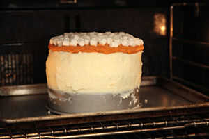 Coloque la bandeja para hornear con la tarta montada en el horno y asar hasta que los malvaviscos estén dorados, aproximadamente 1 a 2 minutos (reloj de cerca para que no se quemen las melcochas). Usando dos espátulas planas, transferir cuidadosamente la torta a un plato de servir. Servir inmediatamente con la salsa, si lo desea.