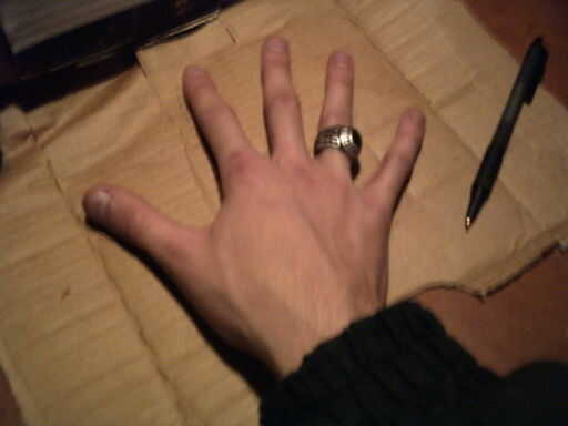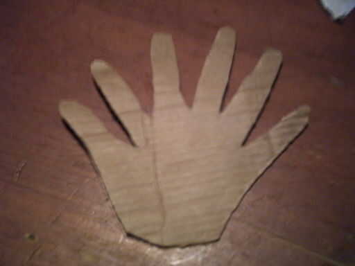 Tome el pedazo de cartón y coloque su mano sobre él. Ahora con un bolígrafo (lápiz, marcador, etc.), trace una línea alrededor de tu mano. Ahora ponga su dedo índice en el espacio entre el trazado dedo índice y el pulgar. Trace una línea alrededor de su dedo índice otra vez, así que ahora que debe estar mirando un 6 dedos mano. Cortar esta forma hacia fuera (redondeo de la parte inferior donde estaba la muñeca) y tiene sus plumas.