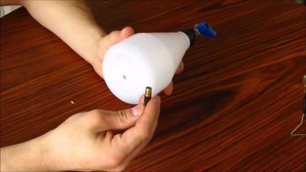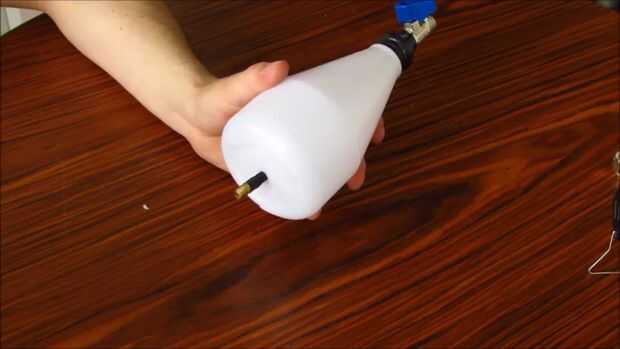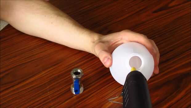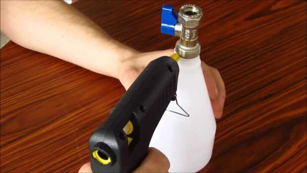 Poner pegamento caliente en el borde de la botella primero el pegamento de una válvula de tubería en. A continuación sellar con pegamento caliente para asegurarse de que es hermética. Cuando se ponga pegamento, fíjela con cinta eléctrica. A continuación, haga un orificio en la parte inferior de la botella lo suficientemente amplia como para empujarlo en la válvula de llanta de bicicleta. Cuando es poner una buena cantidad de pegamento caliente alrededor de él para evitar que el aire para salir de la botella.