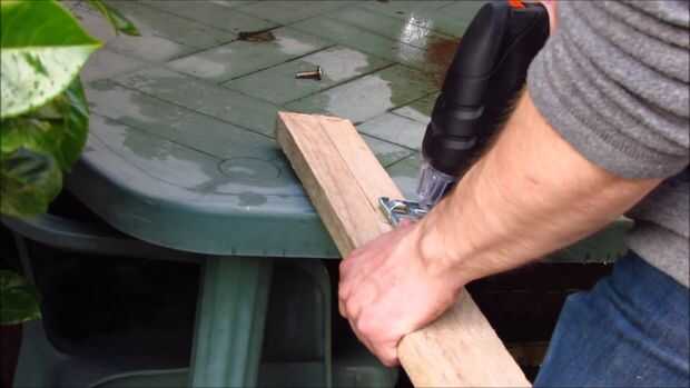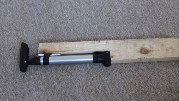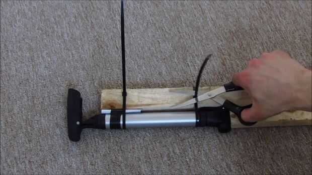 Tomar un trozo de madera (como se muestra en fotos o video de arriba) y corte una pieza como se muestra, al ser el tamaño de la bomba de bicicleta. A continuación coloque la bomba en una brecha de sólo cortar y fijar con sujetacables.