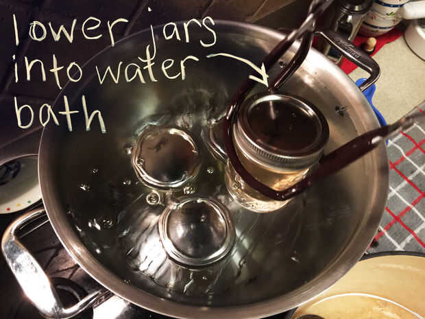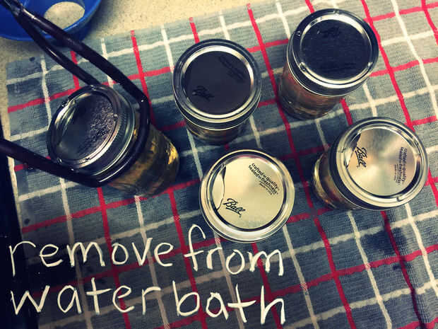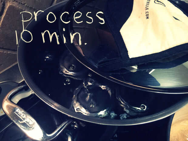 Baje cuidadosamente llenados y sellados de frascos en la olla de baño de agua hirviendo. El agua deje de hervir, esperar a regresar a hervir todo y procesar por 10 minutos.
