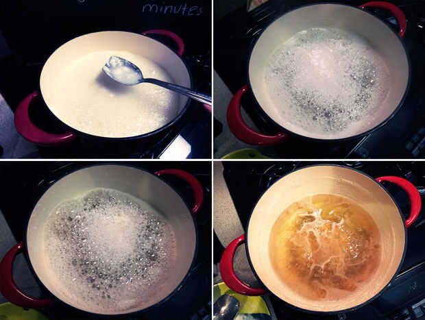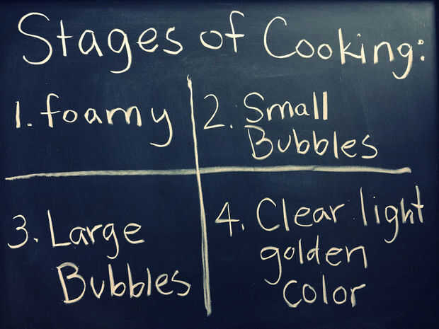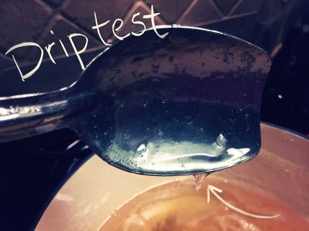 Lo que busque: Inicialmente, la ebullición será muy espumosa, usted debe hojear algunas de la espuma más gruesa que se forma en esta etapa. Después de varios minutos las burbujas balanceo será muy pequeño pero distinto y claro. Después de varios minutos más las burbujas crecerán más grandes, todavía claro. Finalmente el jarabe empezará a girar a un ligero color dorado. En este punto comienzan a mirar para espesar. Mayoría conservadoras guías sugieren utilizar un termómetro de caramelo para controlar temperatura (cuando llegue a 220 grados fahrenheit se gelificará) pero lo hago por la vista. Una vez que las burbujas más grandes sumergir mi cuchara en la mezcla y tire de inclinar hacia los lados, viendo las gotas caer del lado de la cuchara. Una vez que se detecta un poco de viscosidad apague el quemador o remueva del calor y prueba un poco más. Sumergir una cuchara fresca y limpiarla en la mezcla de gelatina y voltéelo de manera que el líquido sale corriendo al lado. La jalea se hace cuando el jarabe forma gotas o una hoja que cuelga por un momento antes goteando apagado. Si el jarabe es todavía demasiado flojo, vuelve a calor alto y hervir algunos minutos otra, repitiendo hasta que la consistencia deseada. Recuerde, usted no necesita el jarabe caliente que cerca como firma como te gustaría la jalea terminada, todavía debe ser líquido y fluido. La jalea espesará a medida que se enfría.